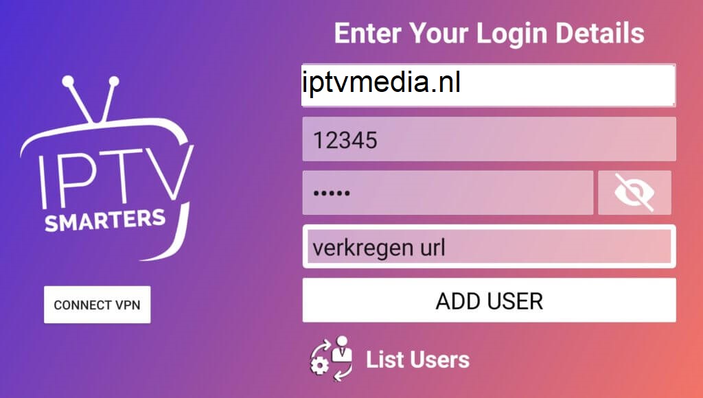 Kiest u voor “Login with Xtream codes API” dan vult u de gegevens in die u van ons ontvangt.