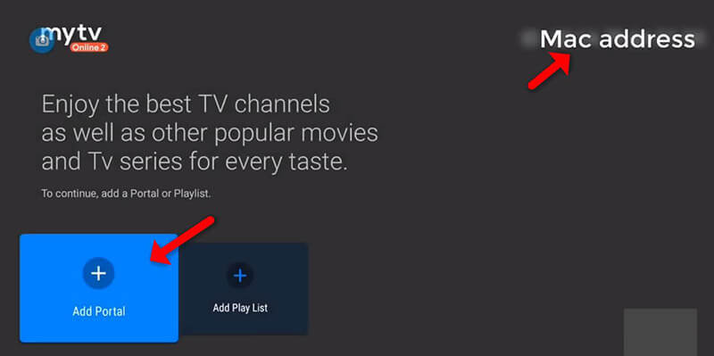 Rechtsboven in het scherm staat uw Mac adres deze dient u door te geven aan uw aanbieder. Klik vervolgens zoals aangegeven op de afbeelding hieronder op “Add portal”. Deze portal ontvangt u ten alle tijden van uw IPTV aanbieder, heeft u deze nog niet neem dan contact op met Uw aanbieder.